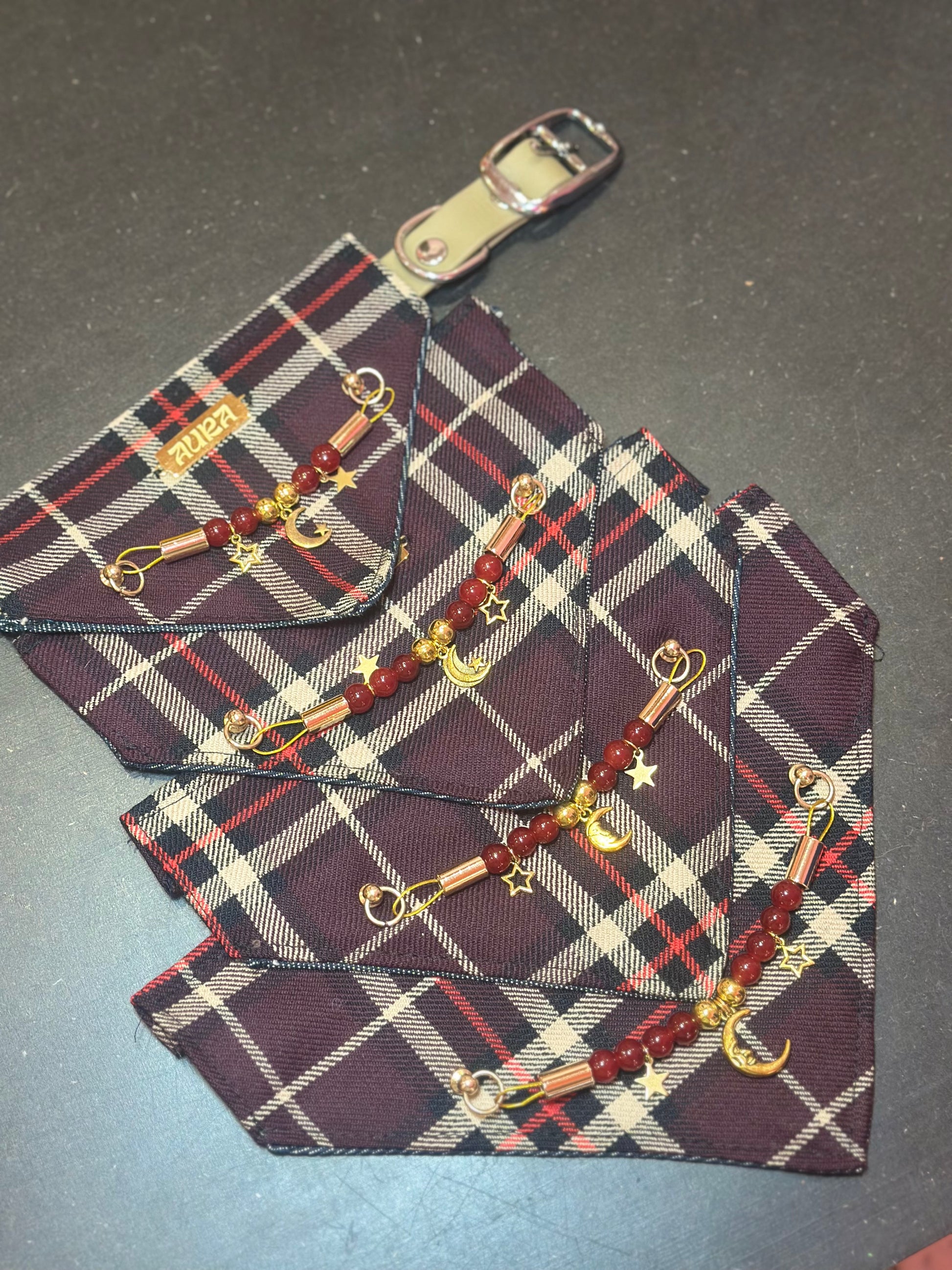 Bandana Bijou Tartan 🎀 Tissu tartan premium et chaîne bijou dorée. Idéal pour briller pendant les fêtes et les occasions spéciales. Arlo pèse 4kg et porte une taille XS